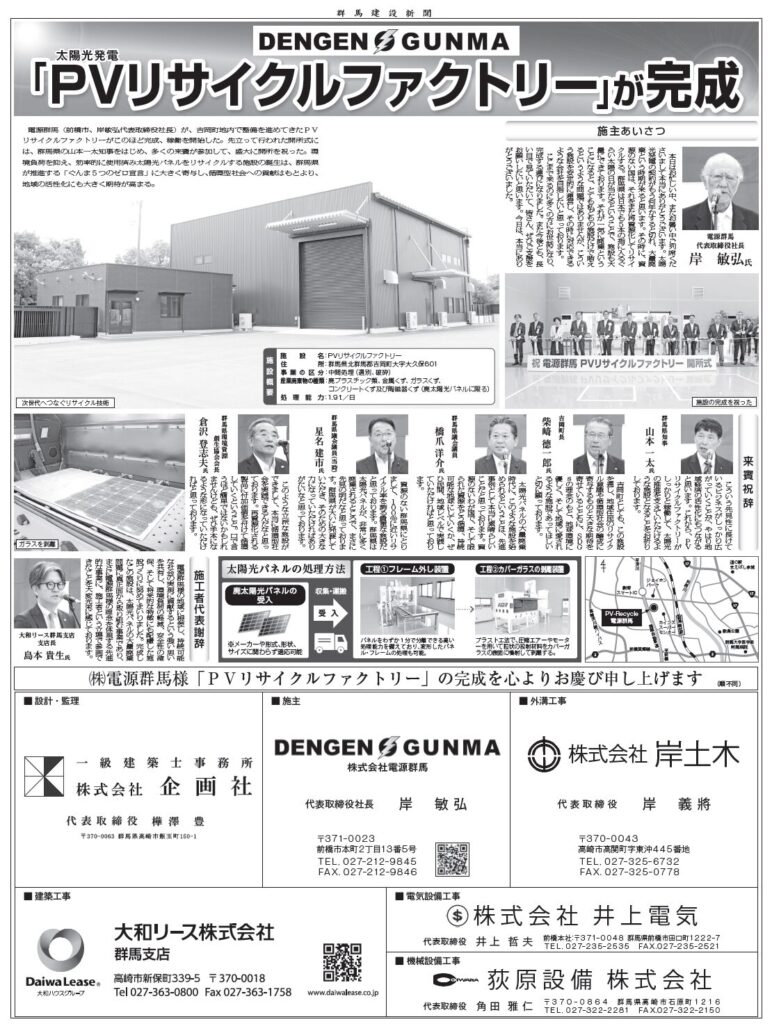 この度、当社の「PVリサイクルファクトリー」(群馬県北群馬郡吉岡町)の竣工特集が、10月10日(金)付の群馬建設新聞に掲載されましたのでお知らせいたします。